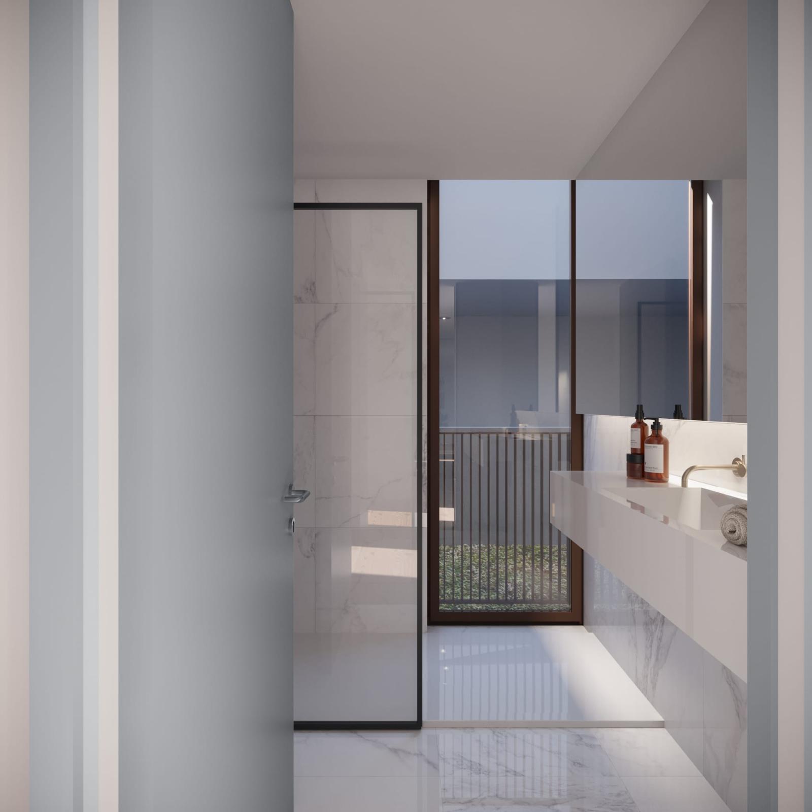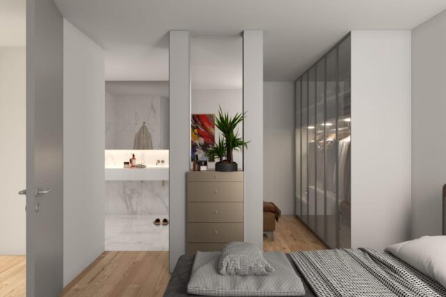 É composto por três quartos com roupeiros embutidos, um deles suíte com casa de banho privativa e closet, casa de banho completa com base de duche de apoio aos outros dois quartos. Um escritório e ainda uma casa de banho de serviço.